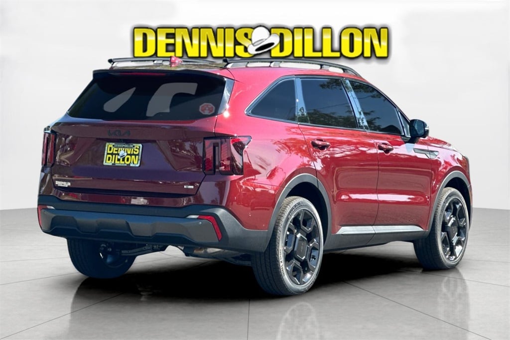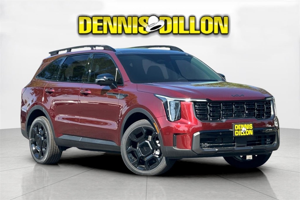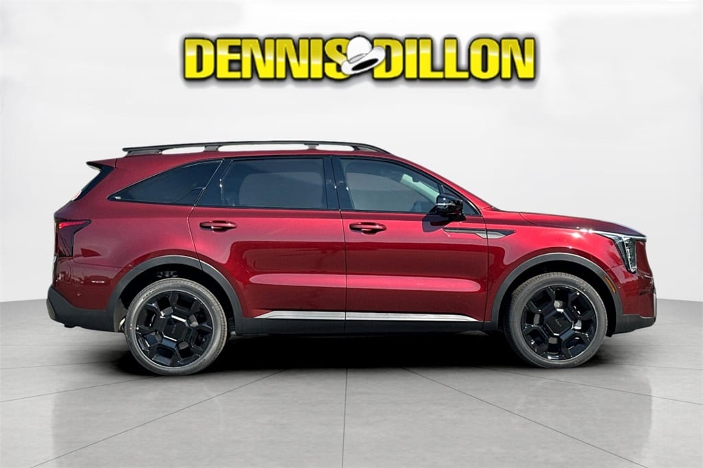 Dawning Red 2025 Kia Sorento X-Line SX AWD 8 Speed Dual Clutch 2.5L I4 DGI Turbocharged DOHC 16V LEV3-SULEV30 281hp 3rd row seats: split-bench, 4-Wheel Disc Brakes, 6 Speakers, ABS brakes, Air Conditioning, Alloy wheels, AM/FM radio: SiriusXM, Apple CarPlay & Android Auto, Auto High-beam Headlights, Auto-dimming Rear-View mirror, Automatic temperature control, Brake assist, Bumpers: body-color, Cargo Net, Cargo Tray, Carpeted Floor Mats, Delay-off headlights, Driver door bin, Driver vanity mirror, Dual front impact airbags, Dual front side impact airbags, Electronic Stability Control, Emergency communication system: 911 Connect, Exterior Parking Camera Rear, Four wheel independent suspension, Front anti-roll bar, Front Bucket Seats, Front Center Armrest, Front dual zone A/C, Front fog lights, Front reading lights, Fully automatic headlights, Heated & Ventilated Front Bucket Seats, Heated door mirrors, Heated front seats, Illuminated entry, Knee airbag, Leather Shift Knob, Leather steering wheel, Low tire pressure warning, Navigation System, Occupant sensing airbag, Outside temperature display, Overhead airbag, Overhead console, Panic alarm, Passenger door bin, Passenger vanity mirror, Power door mirrors, Power driver seat, Power Liftgate, Power moonroof, Power passenger seat, Power steering, Power windows, Radio data system, Radio: AM/FM Standard Sound System, Rain sensing wipers, Rear anti-roll bar, Rear reading lights, Rear side impact airbag, Rear window defroster, Rear window wiper, Remote keyless entry, Security system, Speed control, Speed-sensing steering, Split folding rear seat, Spoiler, Steering wheel mounted audio controls, SynTex Artificial Leather Seat Trim, Tachometer, Telescoping steering wheel, Tilt steering wheel, Traction control, Trip computer, Turn signal indicator mirrors, Variably intermittent wipers, Ventilated front seats, Wheels: 20" Gloss Black X-Line Alloy.