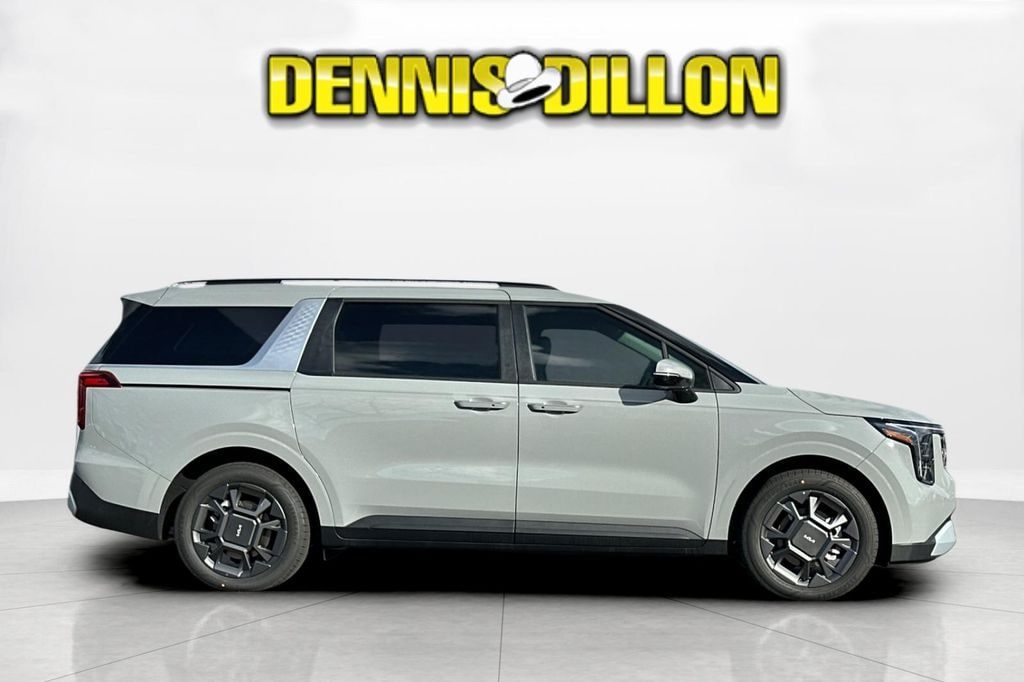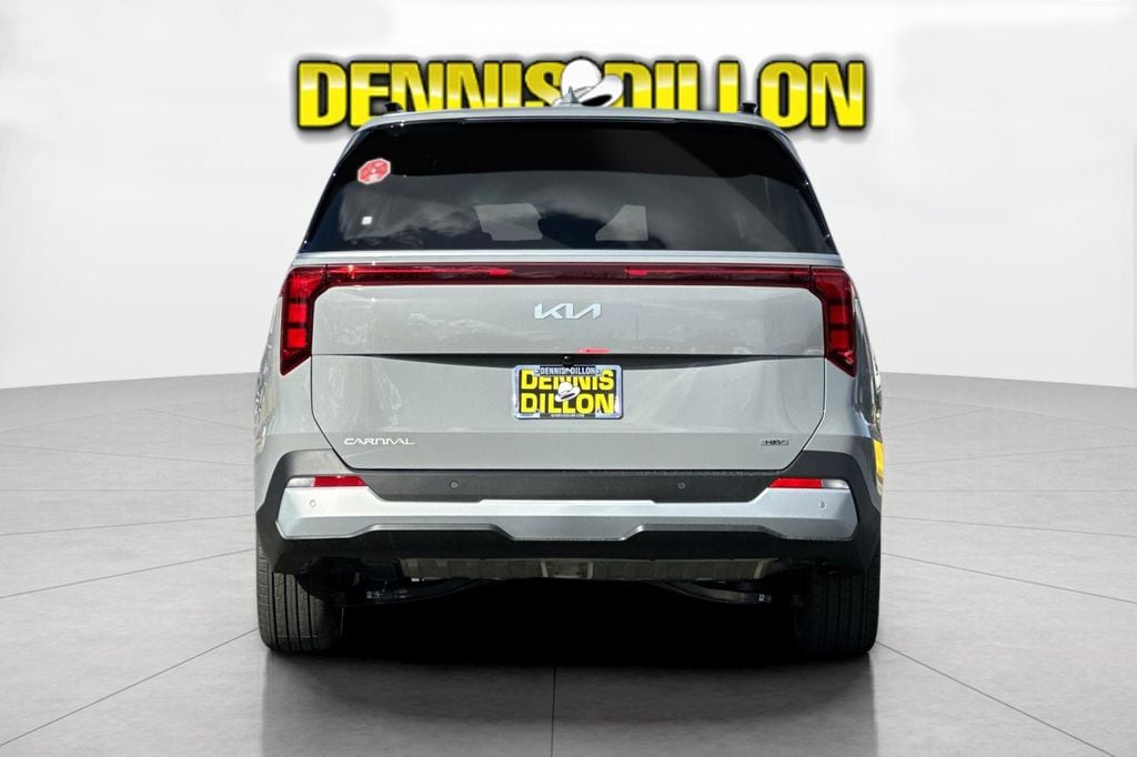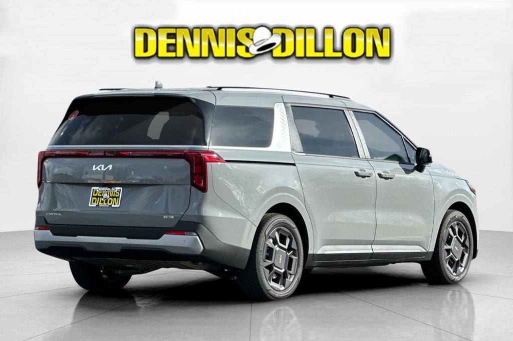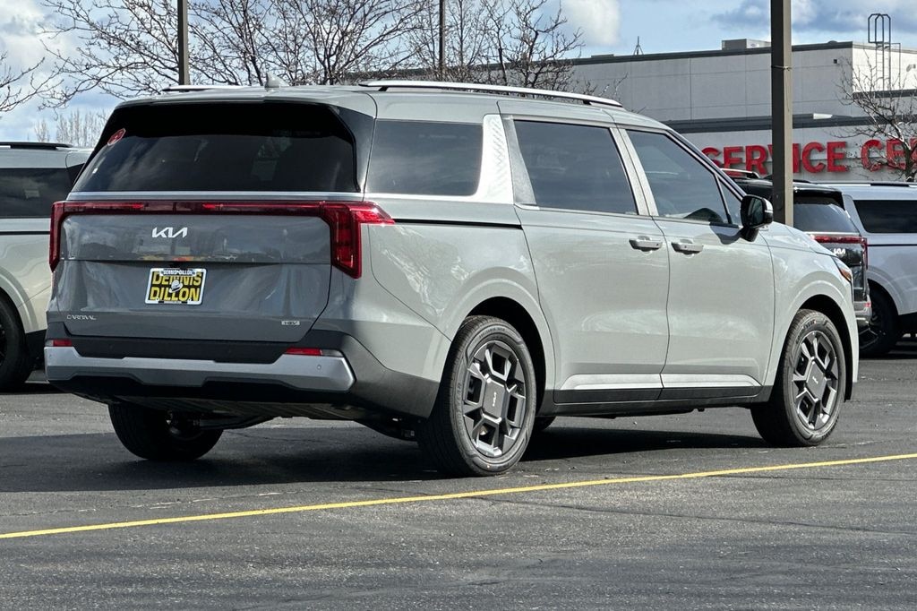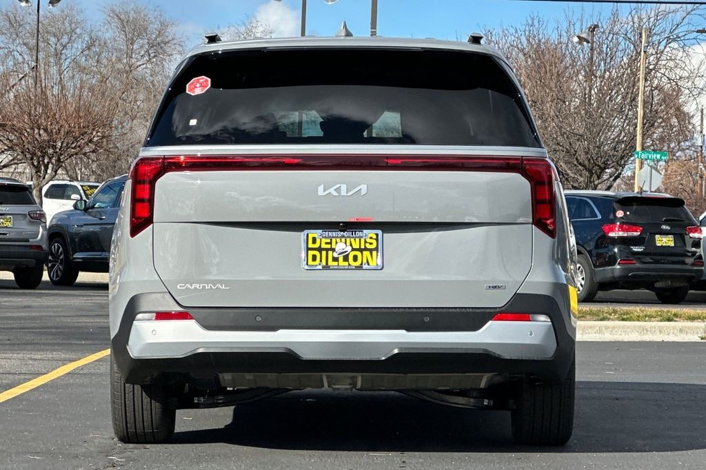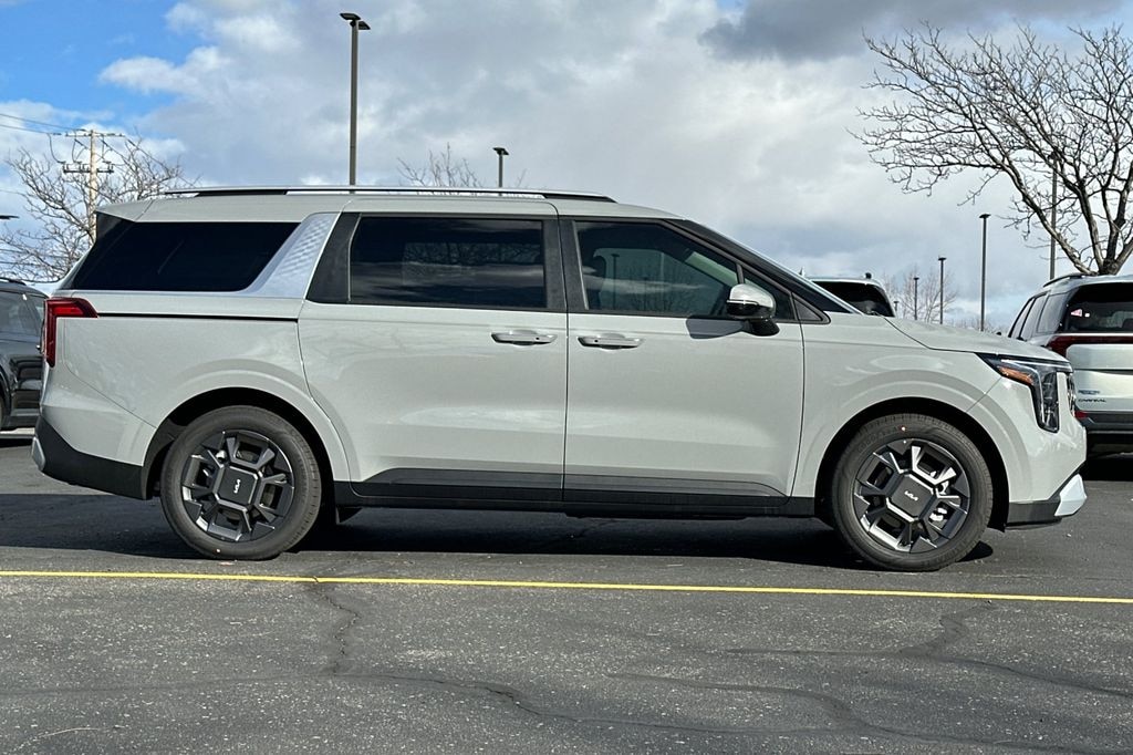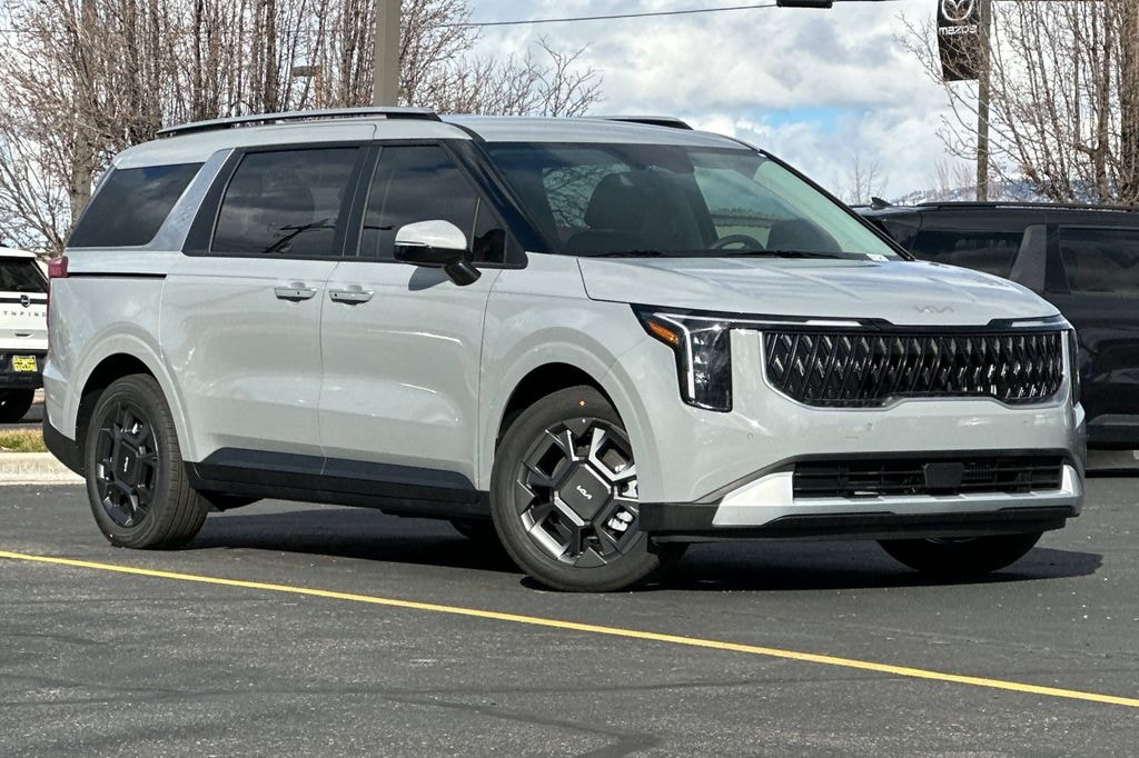 Ceramic Silver 2026 Kia Carnival Hybrid EX FWD 6-Speed Automatic 1.6L I4 DGI Hybrid Turbocharged DOHC 16V LEV3-SULEV30 3rd row seats: split-bench, 4-Wheel Disc Brakes, 8 Speakers, ABS brakes, Air Conditioning, All Weather Floor Mats (8-Passenger), Alloy wheels, AM/FM radio: SiriusXM, Apple CarPlay & Android Auto, Artificial Leather Seat Trim, Auto High-beam Headlights, Automatic temperature control, Brake assist, Bumpers: body-color, Compass, Delay-off headlights, Driver door bin, Driver vanity mirror, Dual front impact airbags, Dual front side impact airbags, Electronic Stability Control, Emergency communication system, Exterior Parking Camera Rear, Four wheel independent suspension, Front anti-roll bar, Front Bucket Seats, Front Center Armrest, Front dual zone A/C, Front reading lights, Fully automatic headlights, Heated door mirrors, Heated Front Bucket Seats, Heated front seats, Illuminated entry, Knee airbag, Leather Shift Knob, Leather steering wheel, Low tire pressure warning, Memory seat, Navigation System, Occupant sensing airbag, Outside temperature display, Overhead airbag, Overhead console, Panic alarm, Passenger door bin, Passenger vanity mirror, Power door mirrors, Power driver seat, Power Liftgate, Power passenger seat, Power steering, Power windows, Radio: : Navigation System with SiriusXM, Rear air conditioning, Rear anti-roll bar, Rear reading lights, Rear window defroster, Rear window wiper, Reclining 3rd row seat, Remote keyless entry, Security system, Speed control, Speed-sensing steering, Split folding rear seat, Spoiler, Steering wheel mounted audio controls, Tachometer, Telescoping steering wheel, Tilt steering wheel, Traction control, Trip computer, Turn signal indicator mirrors, Variably intermittent wipers, Wheels: 19" Black Alloy.