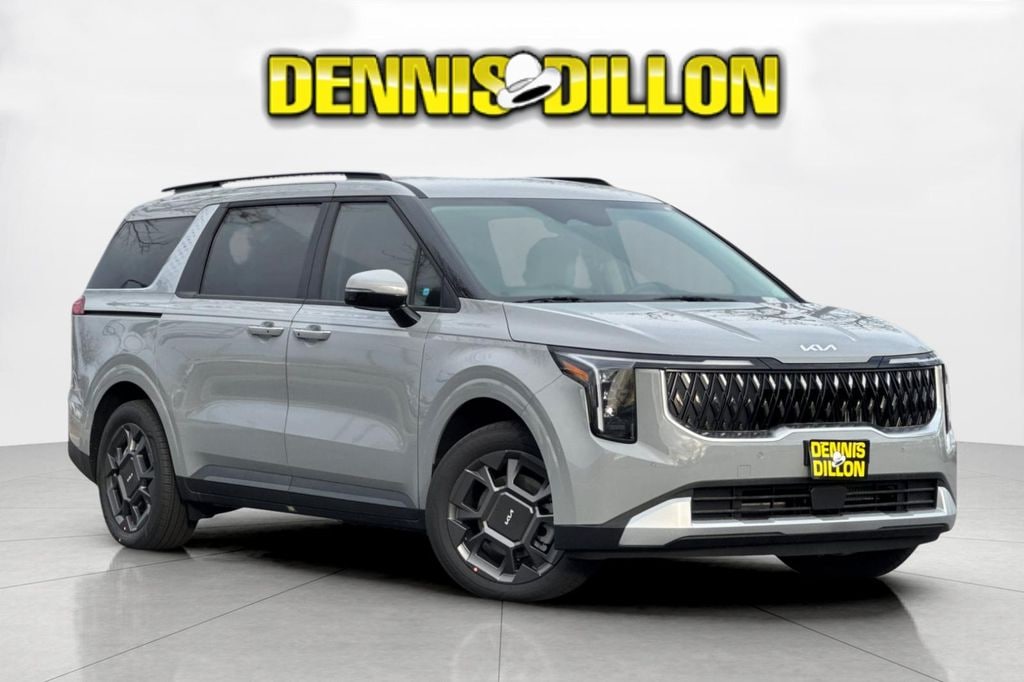 Ceramic Silver 2026 Kia Carnival Hybrid EX FWD 6-Speed Automatic 1.6L I4 DGI Hybrid Turbocharged DOHC 16V LEV3-SULEV30 3rd row seats: split-bench, 4-Wheel Disc Brakes, 8 Speakers, ABS brakes, Air Conditioning, Alloy wheels, AM/FM radio: SiriusXM, Apple CarPlay & Android Auto, Artificial Leather Seat Trim, Auto High-beam Headlights, Automatic temperature control, Brake assist, Bumpers: body-color, Carpeted Floor Mats (8-Passenger), Compass, Delay-off headlights, Driver door bin, Driver vanity mirror, Dual front impact airbags, Dual front side impact airbags, Electronic Stability Control, Emergency communication system, Exterior Parking Camera Rear, Four wheel independent suspension, Front anti-roll bar, Front Bucket Seats, Front Center Armrest, Front dual zone A/C, Front reading lights, Fully automatic headlights, Heated door mirrors, Heated Front Bucket Seats, Heated front seats, Illuminated entry, Knee airbag, Leather Shift Knob, Leather steering wheel, Low tire pressure warning, Memory seat, Navigation System, Occupant sensing airbag, Outside temperature display, Overhead airbag, Overhead console, Panic alarm, Passenger door bin, Passenger vanity mirror, Power door mirrors, Power driver seat, Power Liftgate, Power passenger seat, Power steering, Power windows, Radio: : Navigation System with SiriusXM, Rear air conditioning, Rear anti-roll bar, Rear reading lights, Rear window defroster, Rear window wiper, Reclining 3rd row seat, Remote keyless entry, Security system, Speed control, Speed-sensing steering, Split folding rear seat, Spoiler, Steering wheel mounted audio controls, Tachometer, Telescoping steering wheel, Tilt steering wheel, Traction control, Trip computer, Turn signal indicator mirrors, Variably intermittent wipers, Wheels: 19" Black Alloy.
