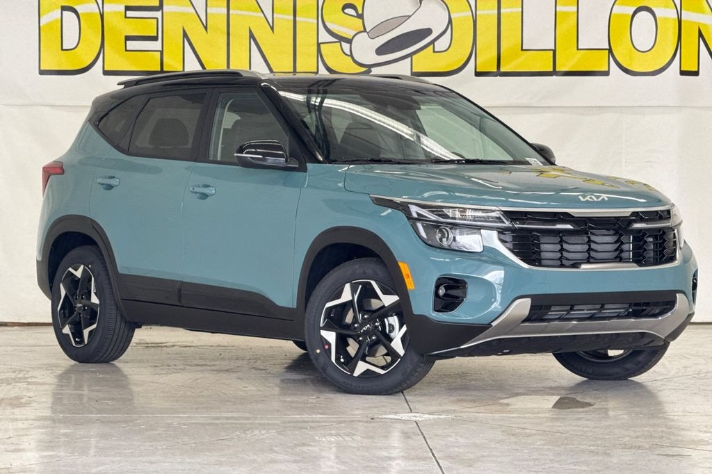 Pluton Blue/Black Roof 2026 Kia Seltos S FWD CVT 2.0L I4 MPI 4-Wheel Disc Brakes, 6 Speakers, ABS brakes, Air Conditioning, Alloy wheels, AM/FM radio: SiriusXM, Apple CarPlay & Android Auto, Auto High-beam Headlights, Automatic temperature control, Brake assist, Bumpers: body-color, Cargo Cover, Carpet Floor Mats, Cloth & Artificial Leather Seat Trim, Delay-off headlights, Driver door bin, Driver vanity mirror, Dual front impact airbags, Dual front side impact airbags, Electronic Stability Control, Emergency communication system: 911 Connect, Exterior Parking Camera Rear, Front anti-roll bar, Front Bucket Seats, Front Center Armrest, Front fog lights, Front reading lights, Front wheel independent suspension, Fully automatic headlights, Glossy Black Door Garnish, Glossy Black Door Garnish Package, Heated door mirrors, Illuminated entry, Leather Shift Knob, Leather steering wheel, Low tire pressure warning, Navigation System, Occupant sensing airbag, Outside temperature display, Overhead airbag, Overhead console, Panic alarm, Passenger door bin, Passenger vanity mirror, Power door mirrors, Power steering, Power windows, Radio: AM/FM/HD/Satellite Display System with Navigation, Rear seat center armrest, Rear window defroster, Rear window wiper, Remote keyless entry, Security system, Speed control, Speed-sensing steering, Split folding rear seat, Spoiler, Steering wheel mounted audio controls, Tachometer, Telescoping steering wheel, Tilt steering wheel, Traction control, Trip computer, Turn signal indicator mirrors, Variably intermittent wipers, Wheels: 17" Alloy with Machined Finished.