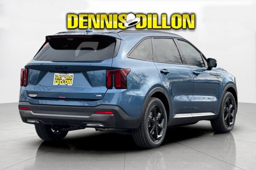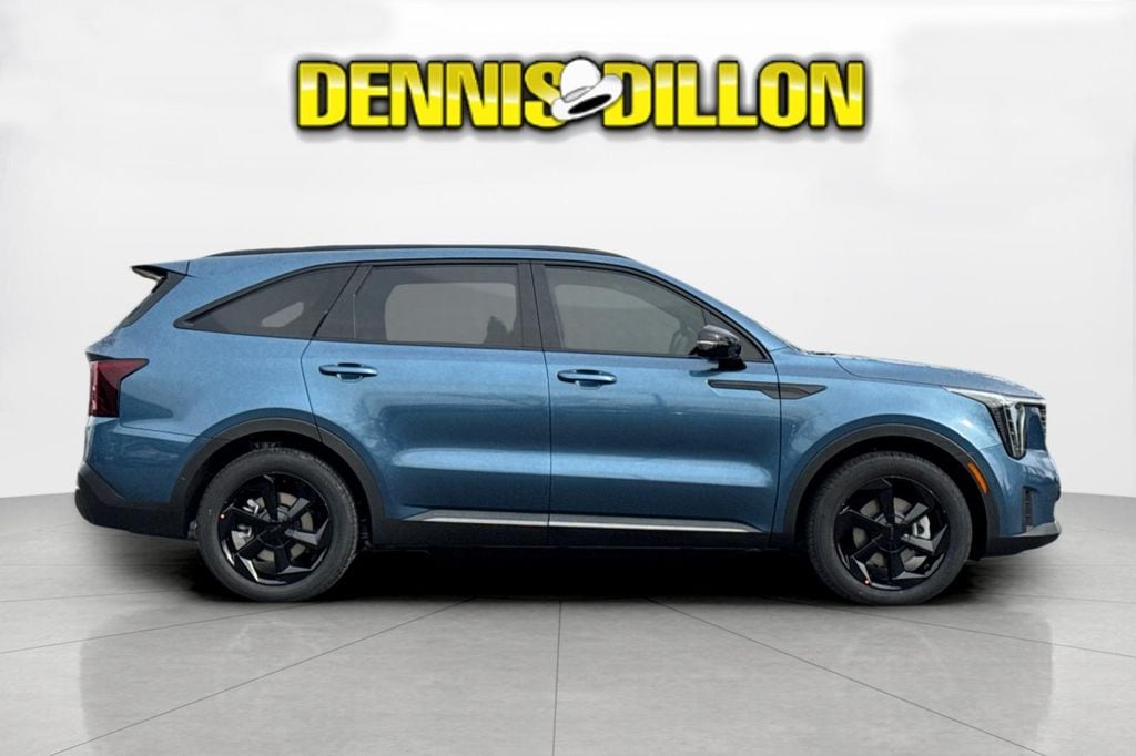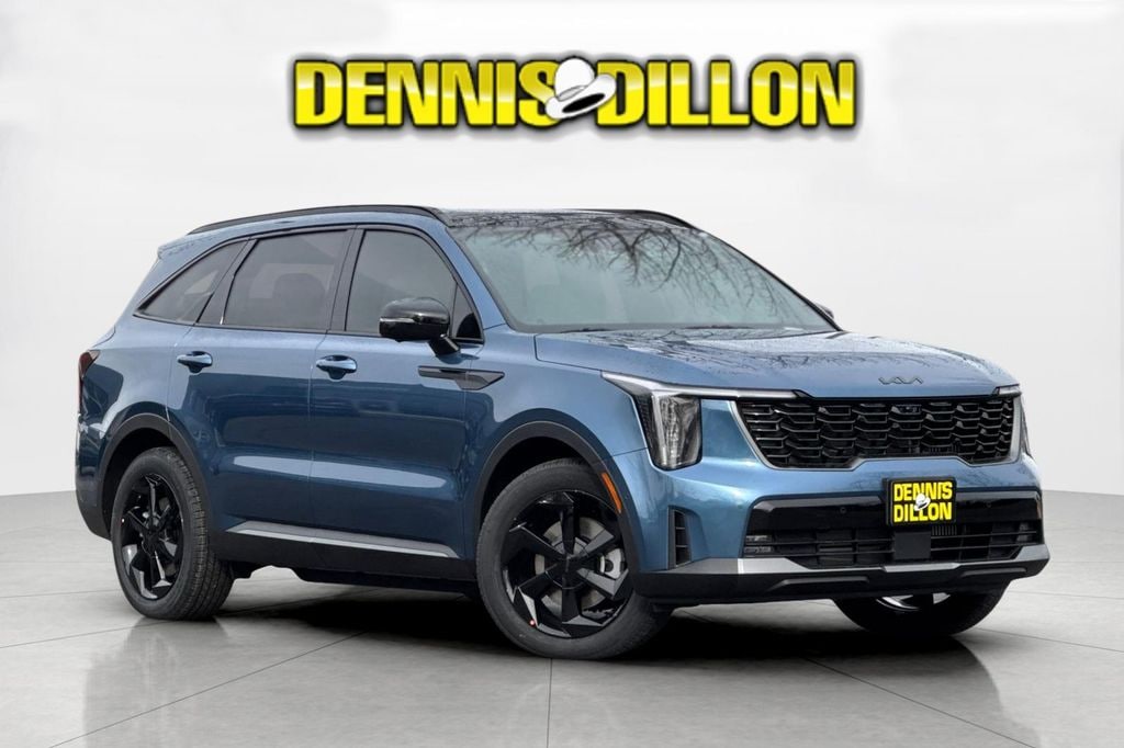 Mineral Blue 2026 Kia Sorento Hybrid X-Line SX Prestige AWD 6-Speed Automatic 1.6L Turbo GDI 4-Cylinder 12 Speakers, 3rd row seats: split-bench, 4-Wheel Disc Brakes, ABS brakes, Air Conditioning, All Weather Floor Mats, Alloy wheels, AM/FM radio: SiriusXM, Apple CarPlay & Android Auto, Auto High-beam Headlights, Auto-dimming Rear-View mirror, Automatic temperature control, Brake assist, Bumpers: body-color, Cargo Cover, Delay-off headlights, Driver door bin, Driver vanity mirror, Dual front impact airbags, Dual front side impact airbags, Electronic Stability Control, Emergency communication system: 911 Connect, Exterior Parking Camera Rear, Four wheel independent suspension, Front anti-roll bar, Front Bucket Seats, Front Center Armrest, Front dual zone A/C, Front fog lights, Front reading lights, Fully automatic headlights, Garage door transmitter: HomeLink, Heated and Ventilated Front Bucket Seats, Heated door mirrors, Heated front seats, Heated rear seats, Heated steering wheel, Illuminated entry, Knee airbag, Leather steering wheel, Low tire pressure warning, Memory seat, Navigation System, Occupant sensing airbag, Outside temperature display, Overhead airbag, Overhead console, Panic alarm, Passenger door bin, Passenger vanity mirror, Perforated Genuine Leather Seat Trim, Power door mirrors, Power driver seat, Power Liftgate, Power moonroof, Power passenger seat, Power steering, Power windows, Radio data system, Radio: AM/FM/SiriusXM Audio System, Rain sensing wipers, Rear anti-roll bar, Rear reading lights, Rear side impact airbag, Rear window defroster, Rear window wiper, Remote keyless entry, Security system, Small First Aid Kit, Speed control, Speed-sensing steering, Split folding rear seat, Spoiler, Steering wheel mounted audio controls, Tachometer, Telescoping steering wheel, Tilt steering wheel, Traction control, Trip computer, Turn signal indicator mirrors, Variably intermittent wipers, Ventilated front seats, Wheels: 19" Machine-Finished Aero Alloy.