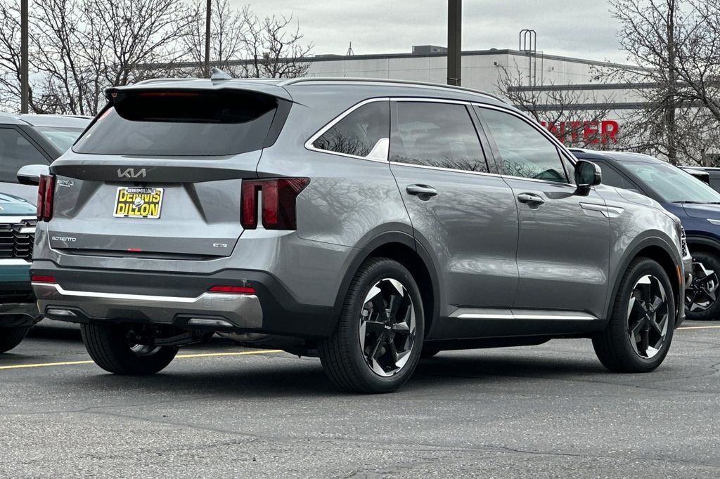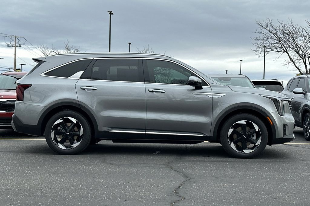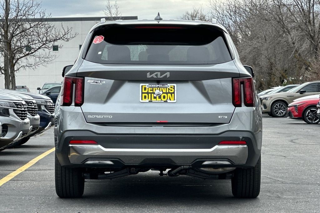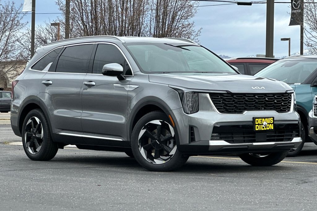 Steel Gray 2026 Kia Sorento Hybrid EX AWD 6-Speed Automatic 1.6L Turbo GDI 4-Cylinder 3rd row seats: split-bench, 4-Wheel Disc Brakes, 6 Speakers, ABS brakes, Air Conditioning, Alloy wheels, AM/FM radio: SiriusXM, Apple CarPlay & Android Auto, Auto High-beam Headlights, Auto-dimming Rear-View mirror, Automatic temperature control, Brake assist, Bumpers: body-color, Carpeted Cargo Mat with Seatback Protection, Carpeted Floor Mats, Delay-off headlights, Driver door bin, Driver vanity mirror, Dual front impact airbags, Dual front side impact airbags, Electronic Stability Control, Emergency communication system: 911 Connect, Exterior Parking Camera Rear, Four wheel independent suspension, Front anti-roll bar, Front Bucket Seats, Front Center Armrest, Front dual zone A/C, Front fog lights, Front reading lights, Fully automatic headlights, Heated door mirrors, Heated Front Bucket Seats, Heated front seats, Illuminated entry, Knee airbag, Leather steering wheel, Low tire pressure warning, Navigation System, Occupant sensing airbag, Outside temperature display, Overhead airbag, Overhead console, Panic alarm, Passenger door bin, Passenger vanity mirror, Power door mirrors, Power driver seat, Power Liftgate, Power passenger seat, Power steering, Power windows, Radio data system, Radio: AM/FM/SiriusXM Audio System, Rear anti-roll bar, Rear reading lights, Rear seat center armrest, Rear side impact airbag, Rear window defroster, Rear window wiper, Remote keyless entry, Security system, Speed control, Speed-sensing steering, Split folding rear seat, Spoiler, Steering wheel mounted audio controls, SynTex Artificial Leather Seat Trim, Tachometer, Telescoping steering wheel, Tilt steering wheel, Traction control, Trip computer, Turn signal indicator mirrors, Variably intermittent wipers, Wheels: 19" x 7.5J Machine-Finished Aero-Alloy.