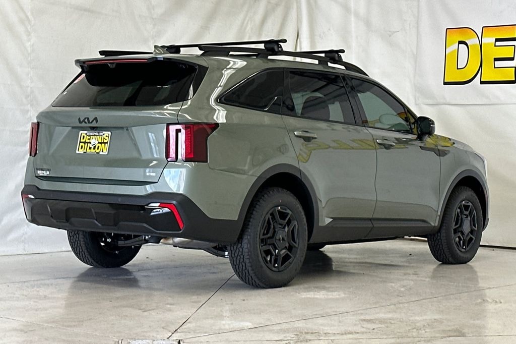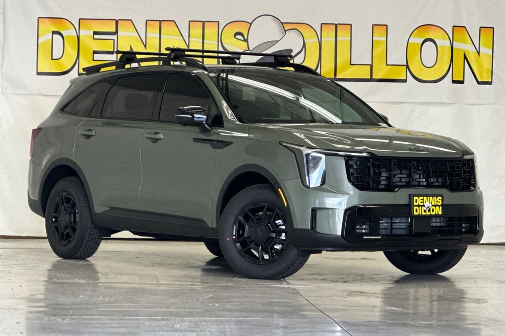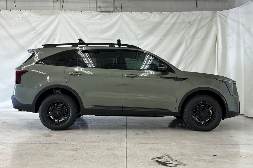 Jungle Green 2026 Kia Sorento X-Pro SX Prestige AWD 8 Speed Dual Clutch 2.5L I4 DGI Turbocharged DOHC 16V LEV3-SULEV30 281hp 12 Speakers, 3rd row seats: split-bench, 4-Wheel Disc Brakes, ABS brakes, Air Conditioning, Alloy wheels, AM/FM radio: SiriusXM, Apple CarPlay & Android Auto, Auto High-beam Headlights, Auto-dimming Rear-View mirror, Automatic temperature control, Brake assist, Bumpers: body-color, Carpeted Floor Mats, Cross Bars X-Line, Delay-off headlights, Driver door bin, Driver vanity mirror, Dual front impact airbags, Dual front side impact airbags, Electronic Stability Control, Emergency communication system: 911 Connect, Exterior Parking Camera Rear, Four wheel independent suspension, Front anti-roll bar, Front Bucket Seats, Front Center Armrest, Front dual zone A/C, Front fog lights, Front reading lights, Fully automatic headlights, Garage door transmitter: HomeLink, Heated and Ventilated Front Bucket Seats, Heated door mirrors, Heated front seats, Heated rear seats, Heated steering wheel, Illuminated entry, Knee airbag, Leather Shift Knob, Leather steering wheel, Low tire pressure warning, Memory seat, Navigation System, Occupant sensing airbag, Outside temperature display, Overhead airbag, Overhead console, Panic alarm, Passenger door bin, Passenger vanity mirror, Perforated Genuine Leather Seat Trim, Power door mirrors, Power driver seat, Power Liftgate, Power moonroof, Power passenger seat, Power steering, Power windows, Radio data system, Radio: AM/FM Bose Premium Audio System, Rain sensing wipers, Rear anti-roll bar, Rear reading lights, Rear side impact airbag, Rear window defroster, Rear window wiper, Remote keyless entry, Security system, Speed control, Speed-sensing steering, Split folding rear seat, Spoiler, Steering wheel mounted audio controls, Tachometer, Telescoping steering wheel, Tilt steering wheel, Traction control, Trip computer, Turn signal indicator mirrors, Variably intermittent wipers, Ventilated front seats, Wheels: 17" x 7.0J Gloss Black Alloy.