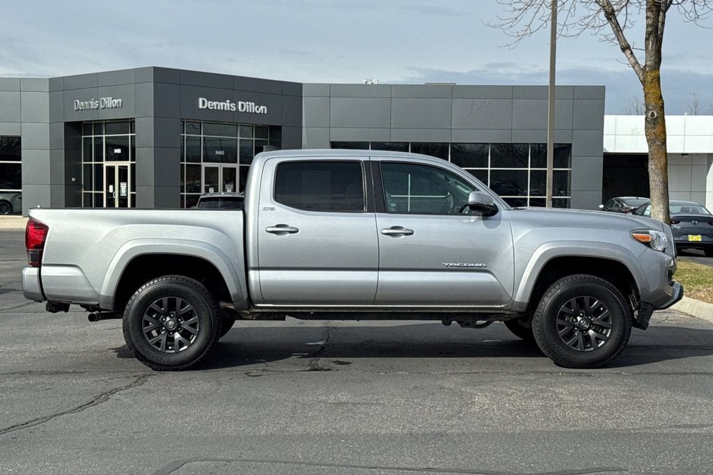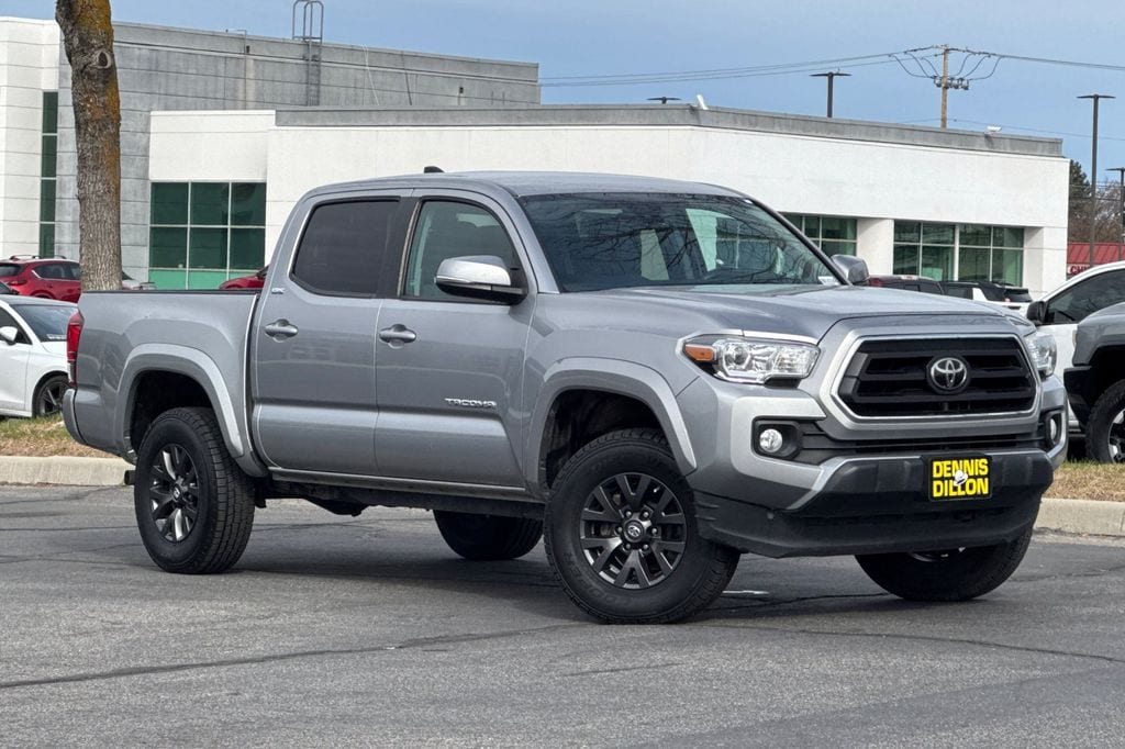 Silver Sky Metallic 2021 Toyota Tacoma SR5 V6 4WD 6-Speed Automatic 3.5L V6 PDI DOHC 24V LEV3-ULEV70 278hp ABS brakes, Air Conditioning, AM/FM radio: SiriusXM, Anti-whiplash front head restraints, Apple CarPlay/Android Auto, Auto High-beam Headlights, Automatic temperature control, Brake assist, Bumpers: body-color, Driver door bin, Dual front impact airbags, Dual front side impact airbags, Electronic Stability Control, Emergency communication system: Safety Connect with 1-year trial, Front anti-roll bar, Front Bucket Seats, Front Center Armrest, Front dual zone A/C, Front reading lights, Front wheel independent suspension, Illuminated entry, Knee airbag, Low tire pressure warning, Occupant sensing airbag, Outside temperature display, Overhead airbag, Overhead console, Passenger door bin, Power door mirrors, Power steering, Power windows, Rear step bumper, Speed control, Speed-sensing steering, Split folding rear seat, Steering wheel mounted audio controls, Tachometer, Telescoping steering wheel, Tilt steering wheel, Traction control, Variably intermittent wipers.